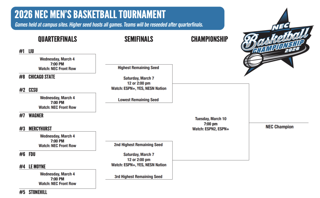 The NEC conference regular season was a two team race between Central Connecticut State and Long Island. The conference reseeds the teams heading into the semi finals. We are destined to get a 1 vs 2 matchup in the title game.