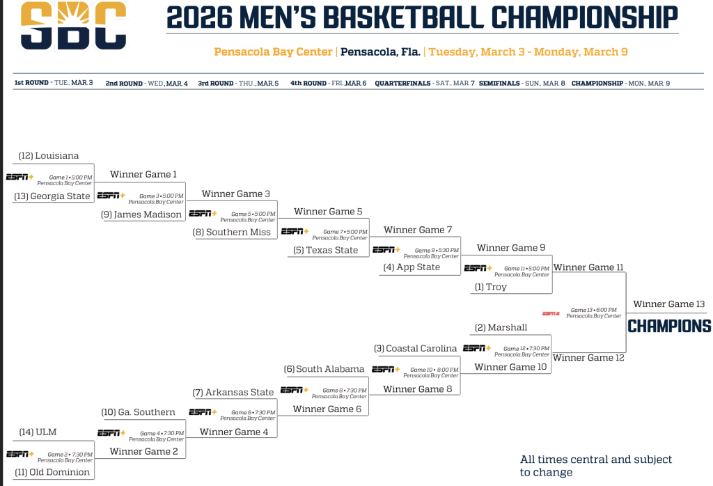 The Sun Belt Conference tournament is a staggered tournament with the top two seeds automatically in the semi-finals. Any other teams will have to win at least three games if not more to advance. The conference regular season ended in a 5 way tie with behind conference winner Troy. Tie breakers make a tough tourney for those 5th, 6th and 7th.